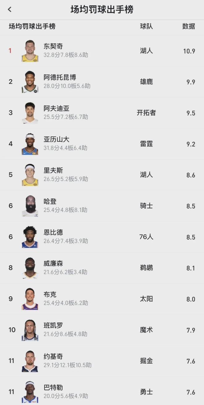 湖人后卫里夫斯继续替补出战,勇士主帅科尔赛前说道:“你不能在里夫斯面前轻易伸手,否则他就会造犯规。”里夫斯本赛季场均8.6次罚球排名联盟第五,仅次于东契奇(10.9)、字母哥(9.9)、阿福迪亚(9.5)和亚历山大(9.2)。