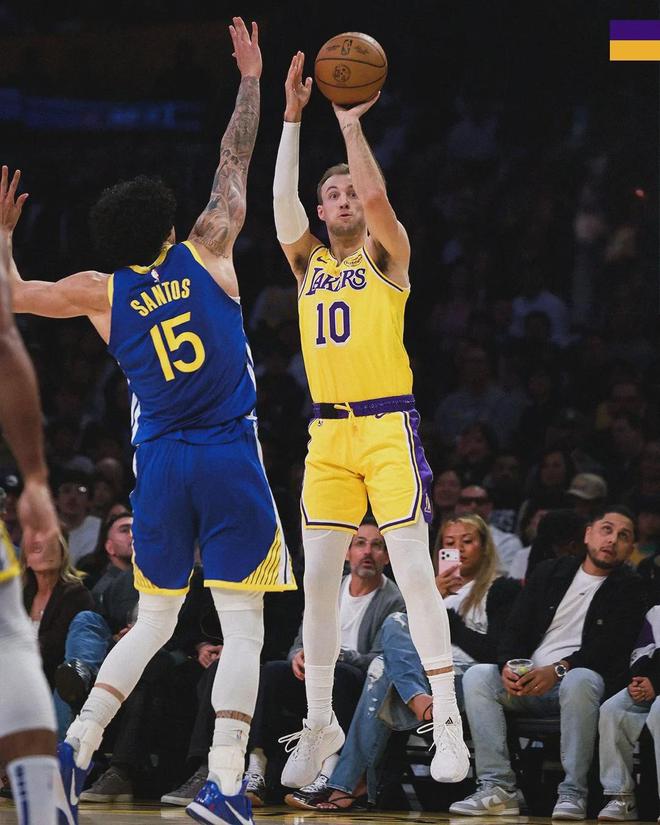 勇士上半场11次助攻8次失误,两队“助攻失误比”都接近1比1。湖人两大核心詹姆斯和里夫斯手感冰凉,詹姆斯8中2得到7+6+4,里夫斯5中1得到3+4+7。上半场最后一攻,斯潘塞迎着詹姆斯压哨跳投打进,库里在场边看嗨了。