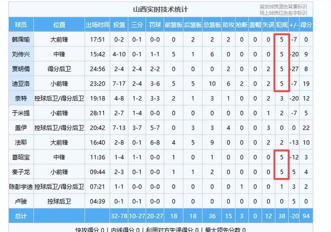 具有讽刺意味的是,山西队输了比分,但是他们赢了犯规,全队38次犯规,比上海队犯规多了16次,全场四次与上海队发生冲突,其中迪亚洛与王哲林、白边发生两次冲突,迪亚洛和白边各领了一个技术犯规,贾明儒等人与古德温也发生冲突,大大小小的冲突发生了四次,贾明儒和于米提被判违体犯规。