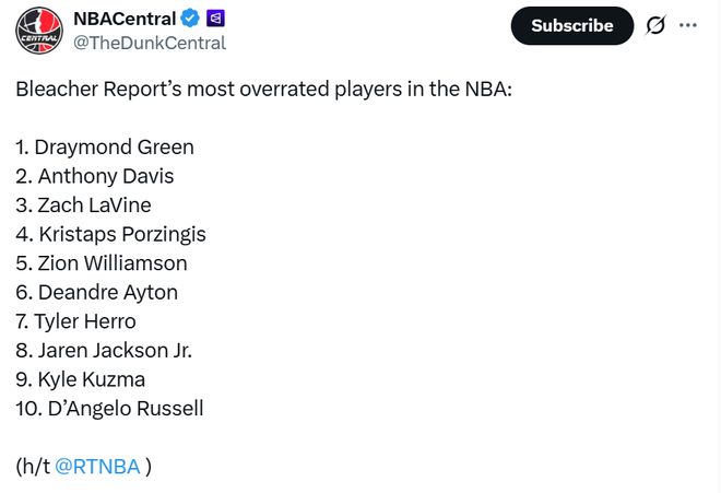 美媒评现役最被高估球员TOP10!前五勇士独占两席 浓眉哥高居第二