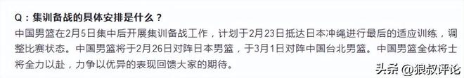 根据此前中国篮协官方社媒公示,中国男篮在国家体育总局的集训时间为2月5日至2月23日,也就是说距离出发远征日本客场,仅仅剩下2天时间。