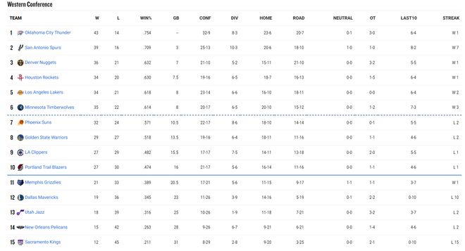 西部排名:雷霆、马刺、掘金、火箭、湖人、森林狼、太阳、勇士、快船、开拓者、灰熊、独行侠、爵士、鹈鹕、国王。