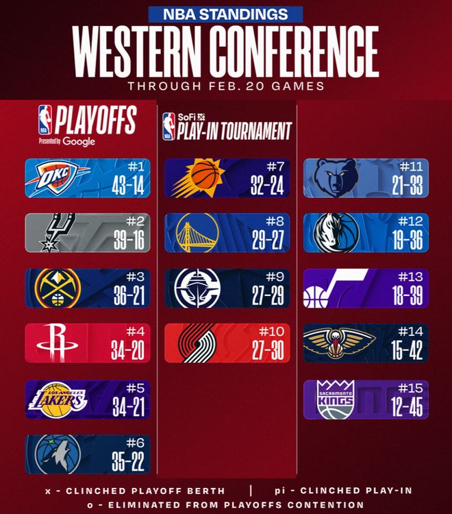 北京时间2月21日的常规赛打完后,西部的格局又发生了一些变化,雷霆大胜篮网但还是丢掉了联盟第一,因为胜率已经不如活塞;快船逆转湖人失败但开拓者惨败掘金,快船还是稳住了西部第九的席位。湖人与森林狼没有胜场差,湖人是艰难压制森林狼。