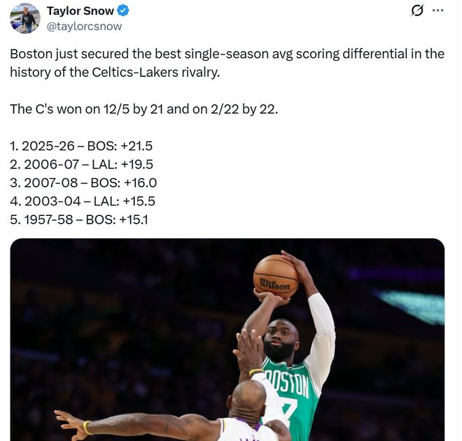 湖人队不仅被凯尔特人队常规赛双杀横扫, 两场还一共输掉43分之多,场均净输21.5分创造凯湖单赛季场均胜分差新高。