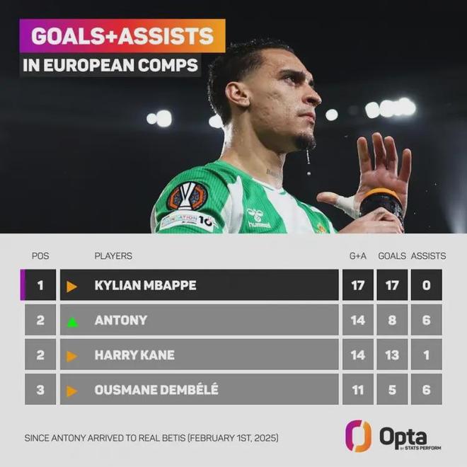 自2025年2月1日加盟皇家贝蒂斯以来,安东尼在不含预选赛的欧战中,已经直接参与了14粒进球(8球6助攻)。这是什么概念?在整个欧洲足坛的同期数据中,只有皇马的姆巴佩(17球)比他多,甚至与哈里·凯恩持平!