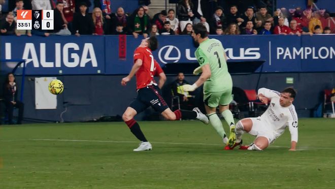 奥萨苏纳持续的围攻,令皇马的禁区风声鹤唳!仅仅几分钟,布季米尔又是惊艳的头球,击中横梁弹出!第36分钟,库尔图瓦禁区放倒了布季米尔,裁判经过视频回放之后,直接吹罚点球!布季米尔主罚命中,1:0!比分落后,但是皇马仍旧没有反扑的迹象,这个比分也被维持到了半场结束。