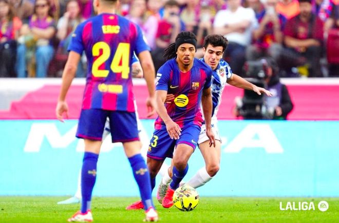 第3分钟,坎塞洛在左路闪转腾挪、停顿加速甩开防守后传中,孔德包抄的射门放了高射炮,巴萨两大边后卫的连线引来主场球迷的阵阵掌声。